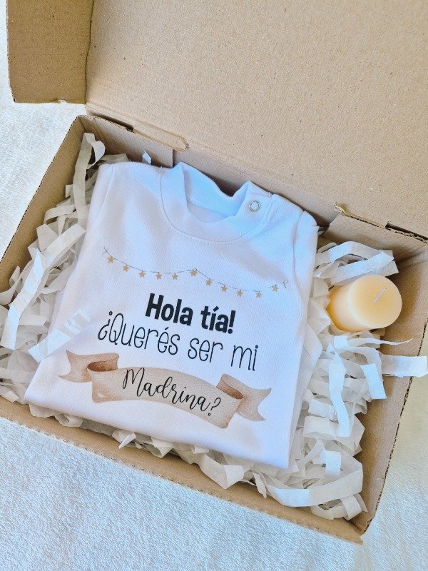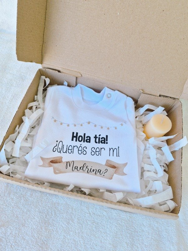 Contiene un body de 100% algodón con una frase y una vela aromática.
