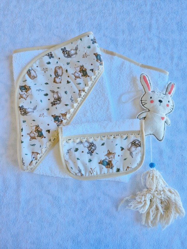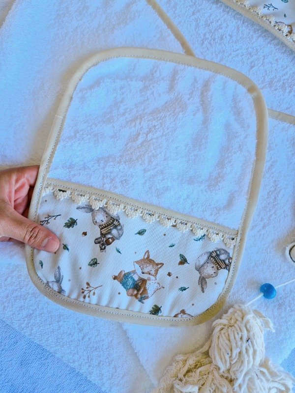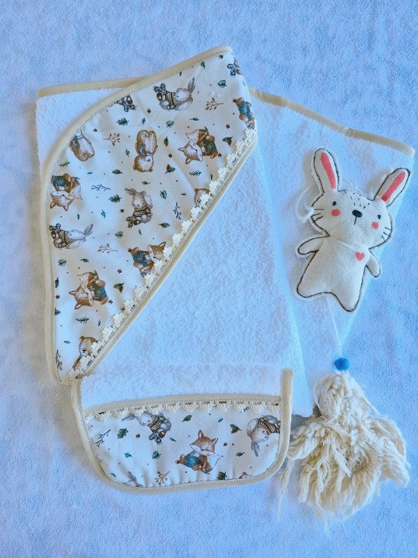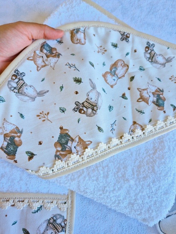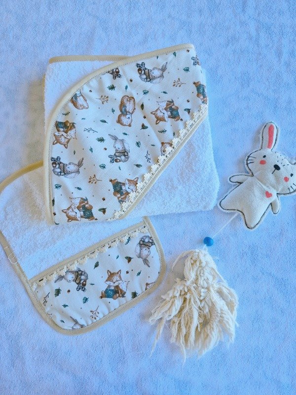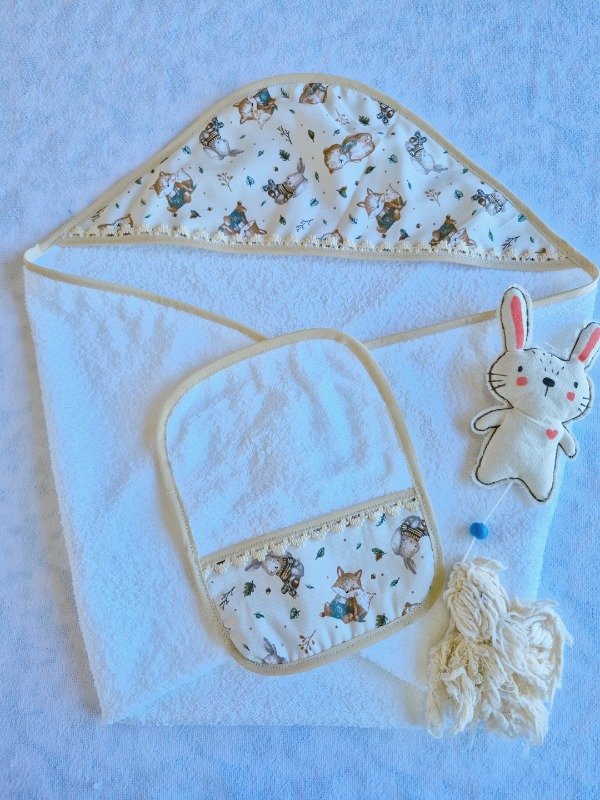 Toallón doble felpa con capucha de toalla,decorado con puntilla y Babita haciendo juego.