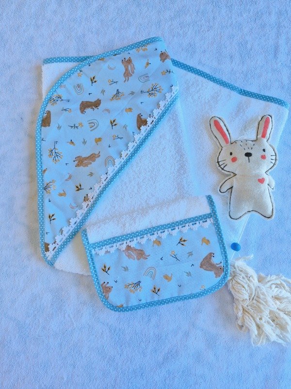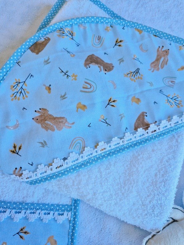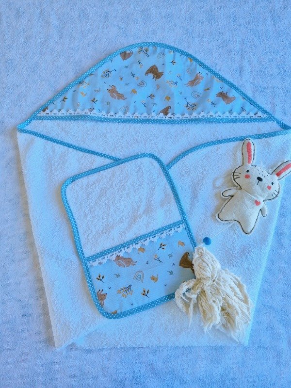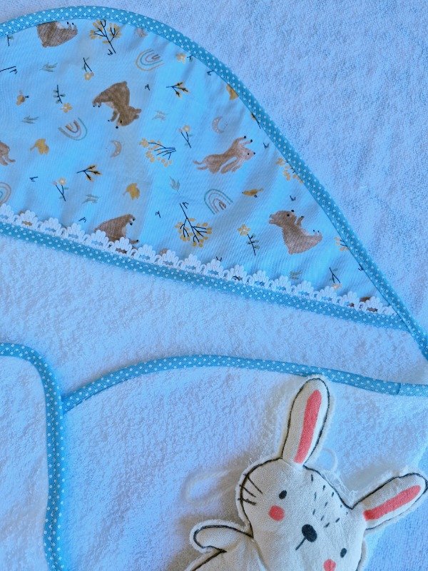 Toallón doble felpa con capucha de toalla,decorado con puntilla y Babita haciendo juego.