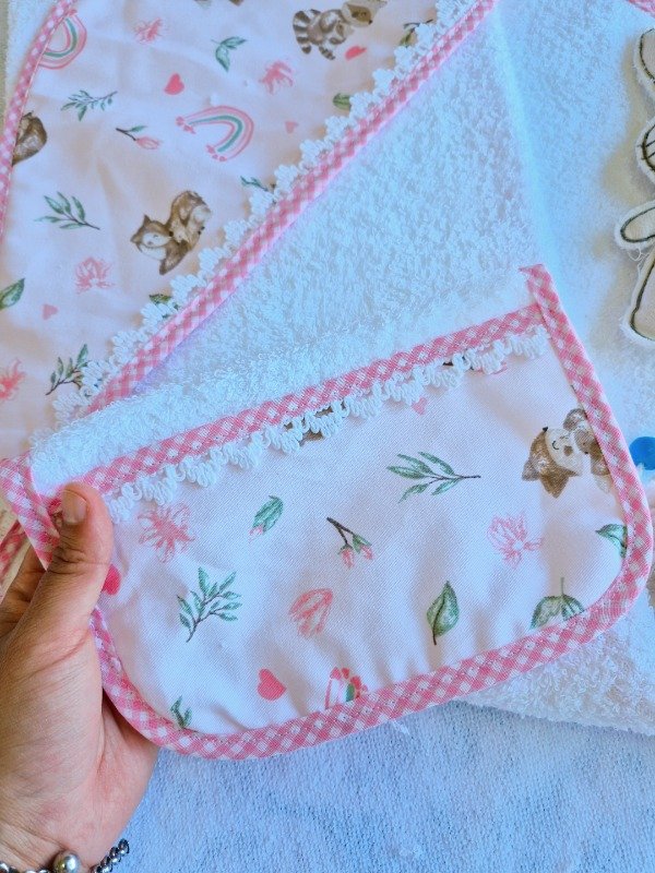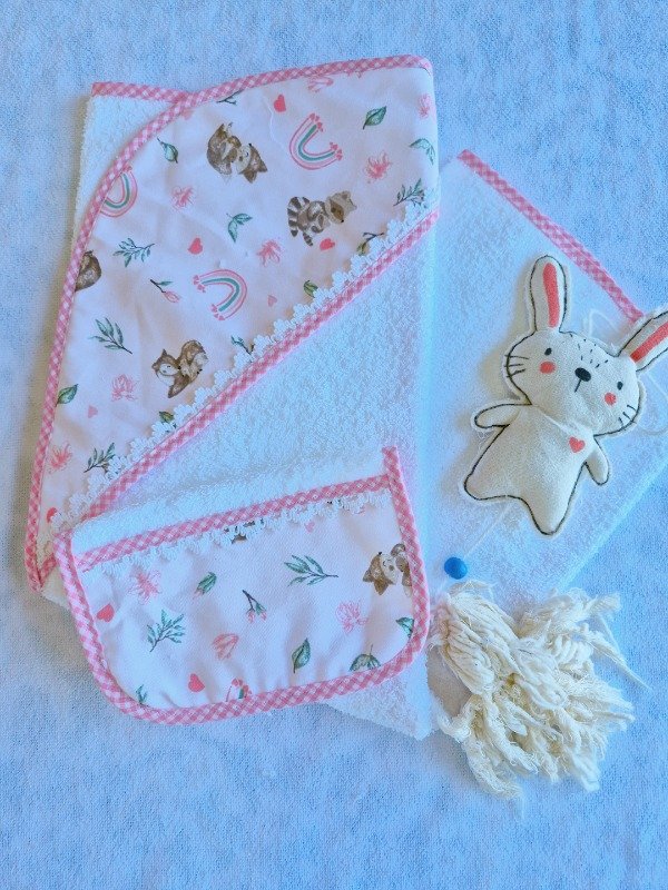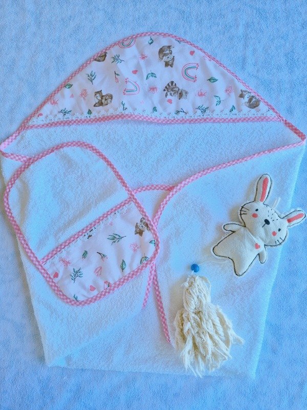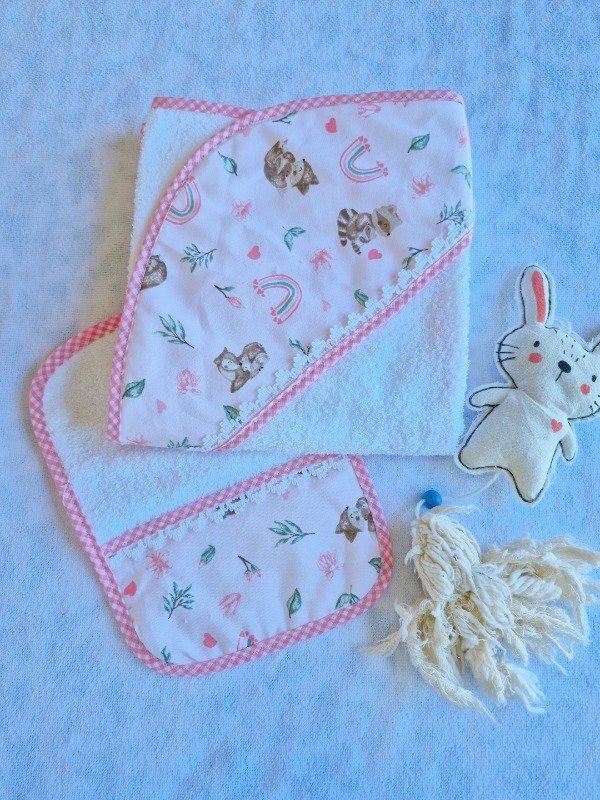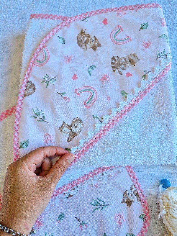 Toallón doble felpa con capucha de toalla,decorado con puntilla y Babita haciendo juego.