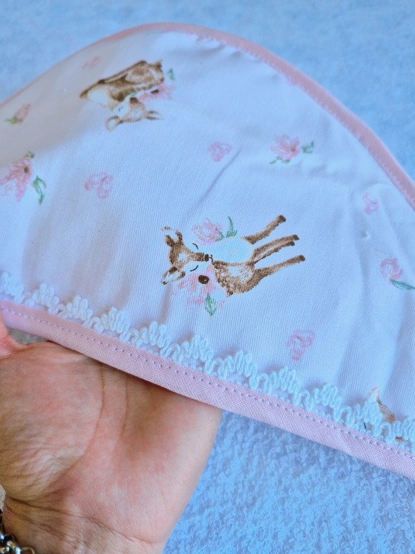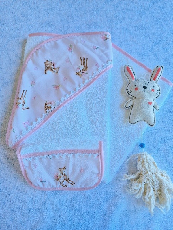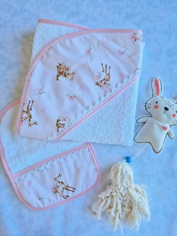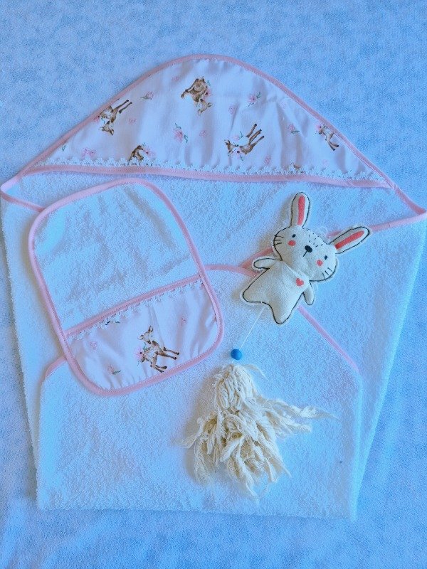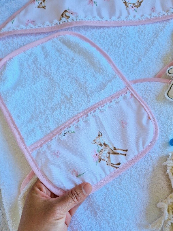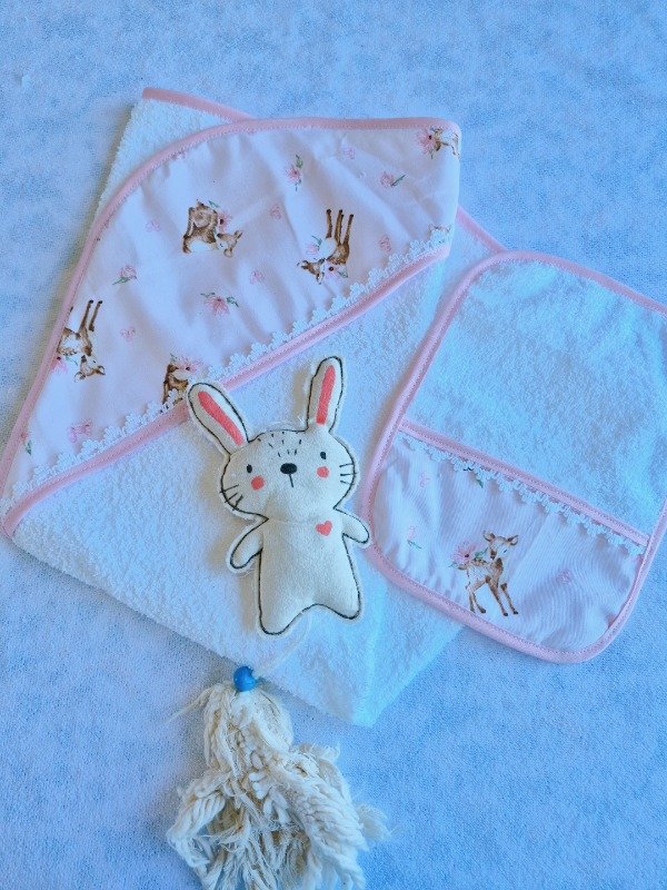 Toallón doble felpa con capucha de toalla,decorado con puntilla y Babita haciendo juego.