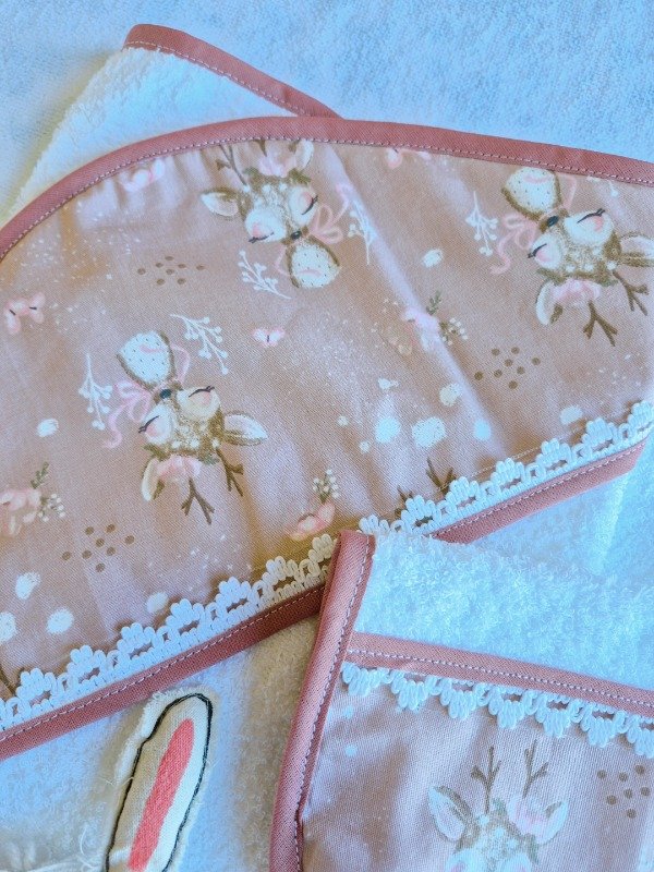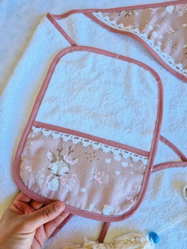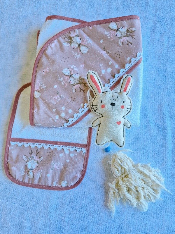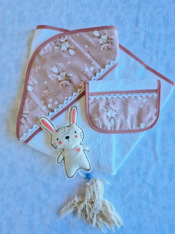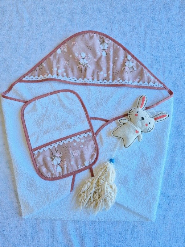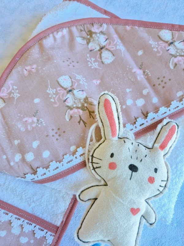 Toallón doble felpa con capucha de toalla,decorado con puntilla y Babita haciendo juego.