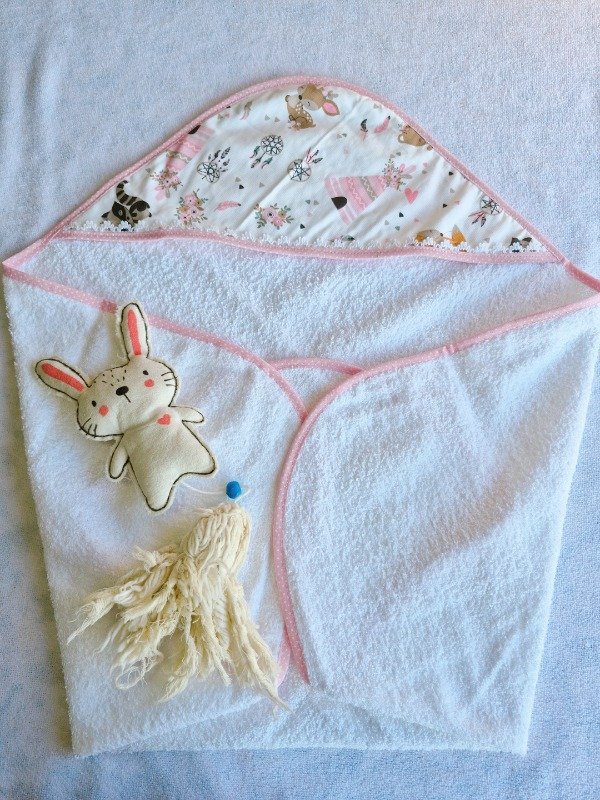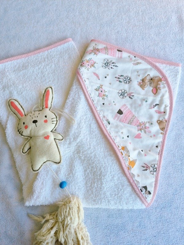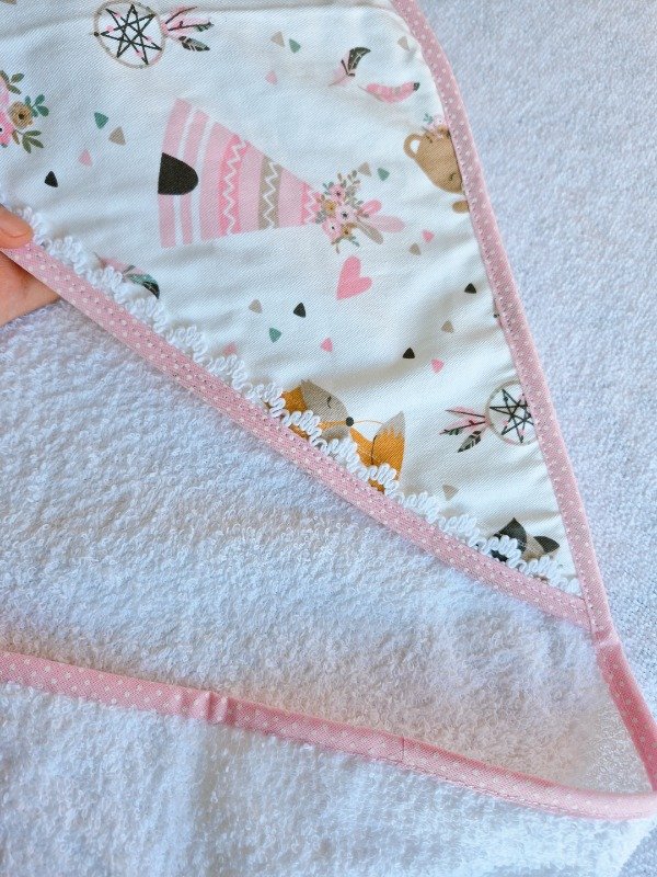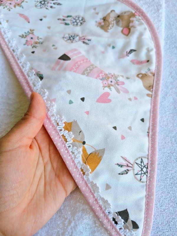 Con capucha de toalla y tela estampada con detalles de puntilla🤍