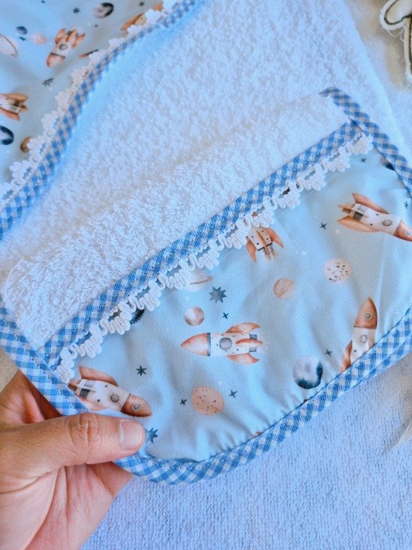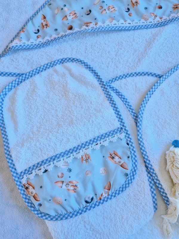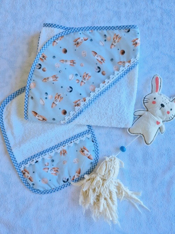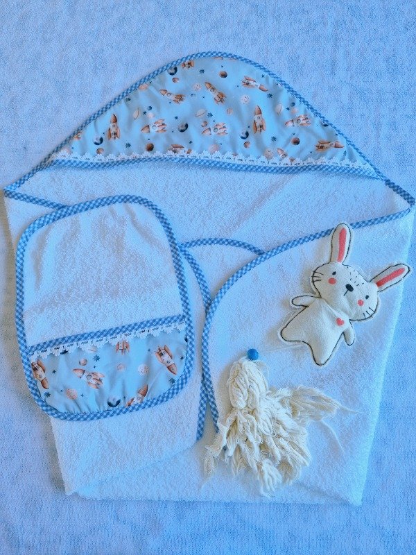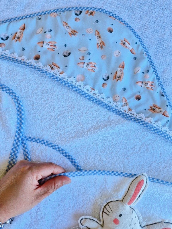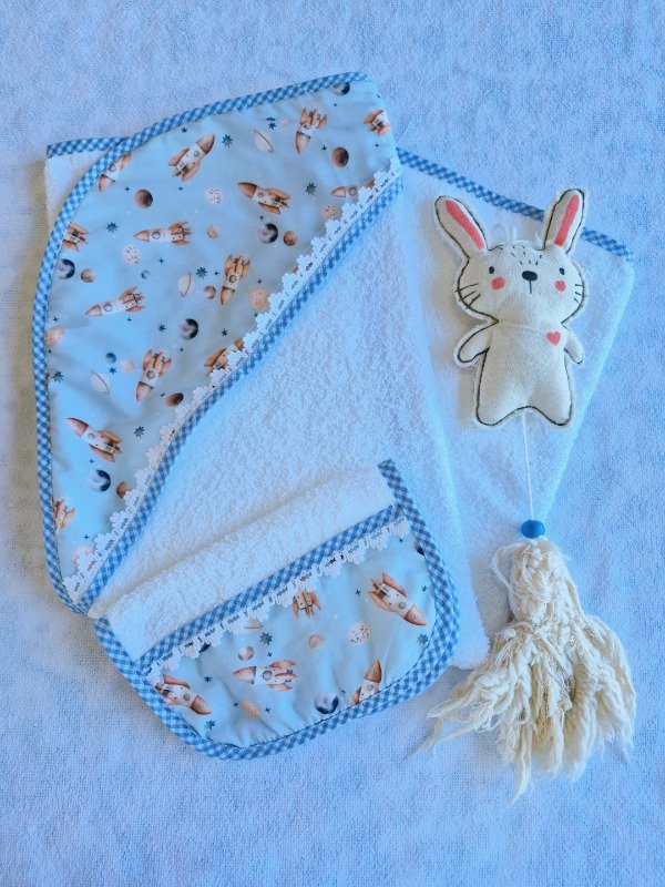 Toallón doble felpa con capucha de toalla,decorado con puntilla y Babita haciendo juego.