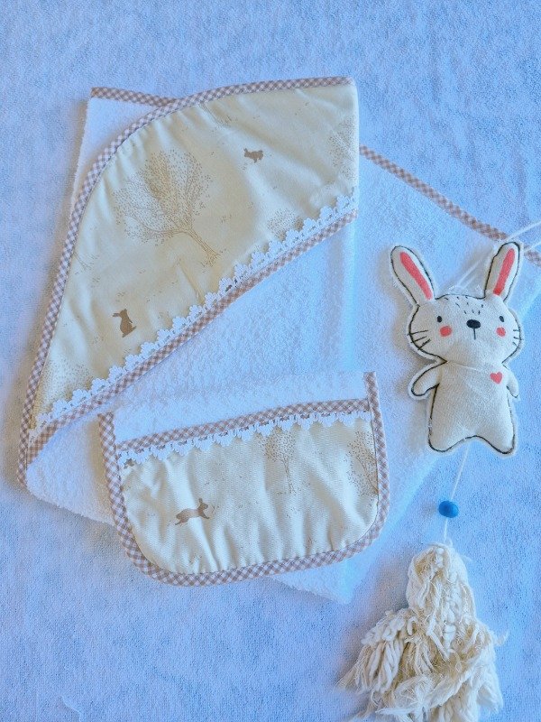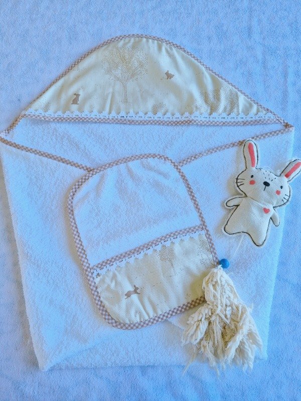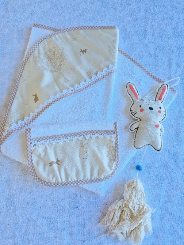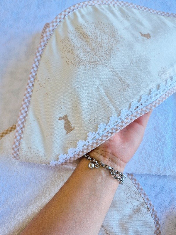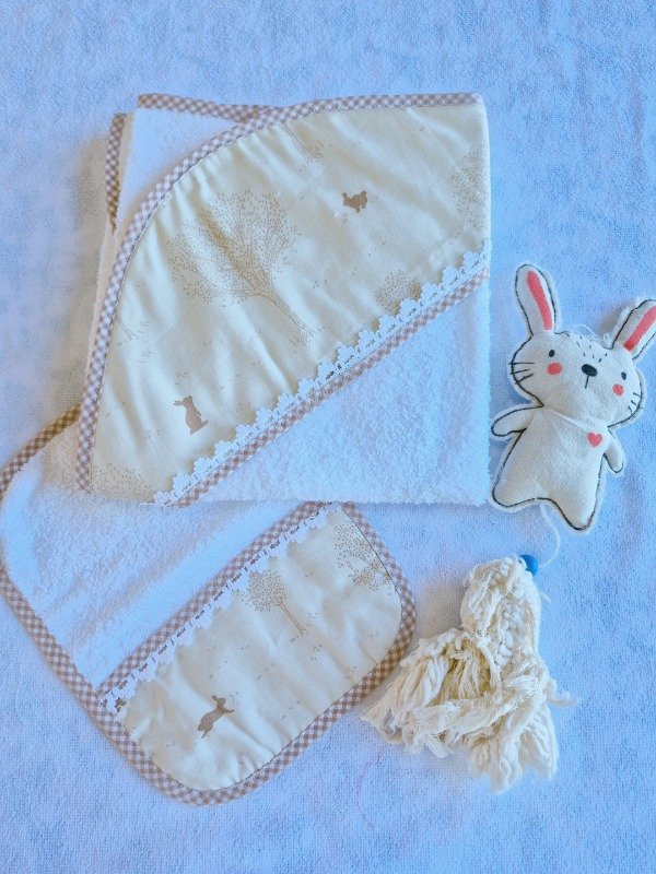 Toallón doble felpa con capucha de toalla,decorado con puntilla y Babita haciendo juego.