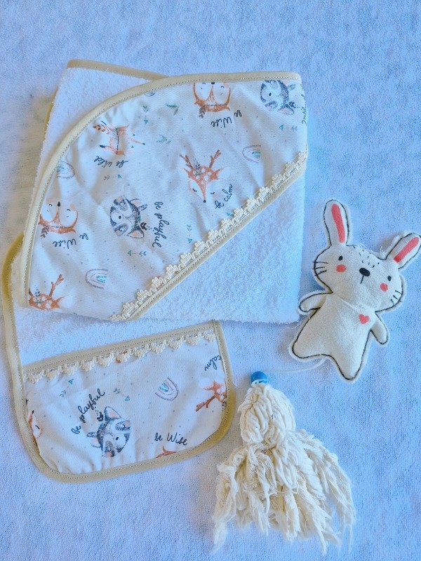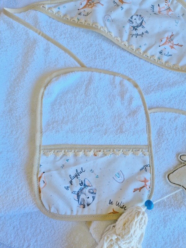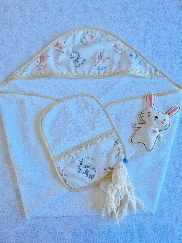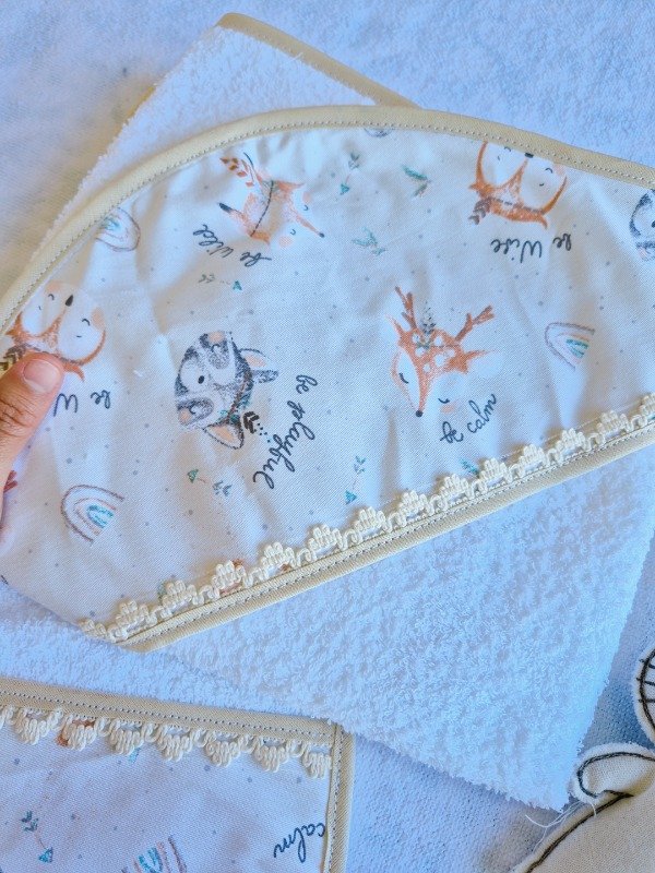 Toallón doble felpa con capucha de toalla,decorado con puntilla y Babita haciendo juego.