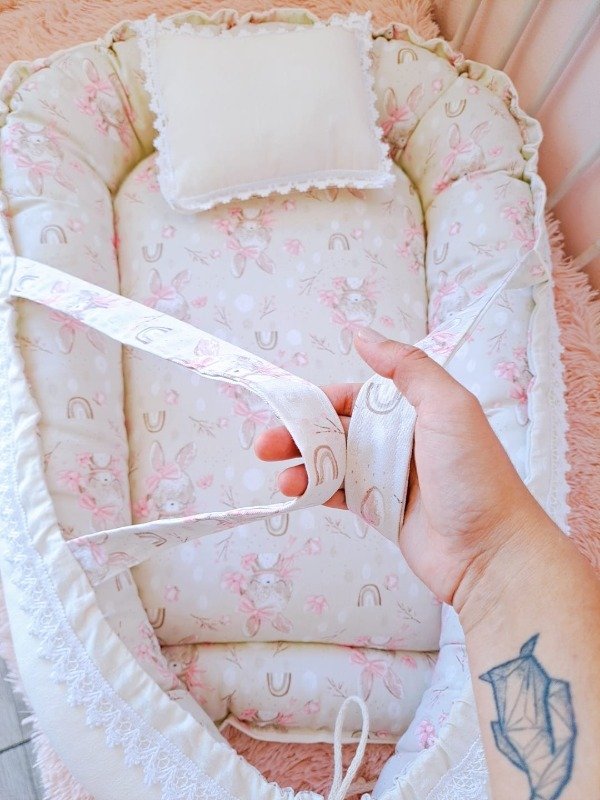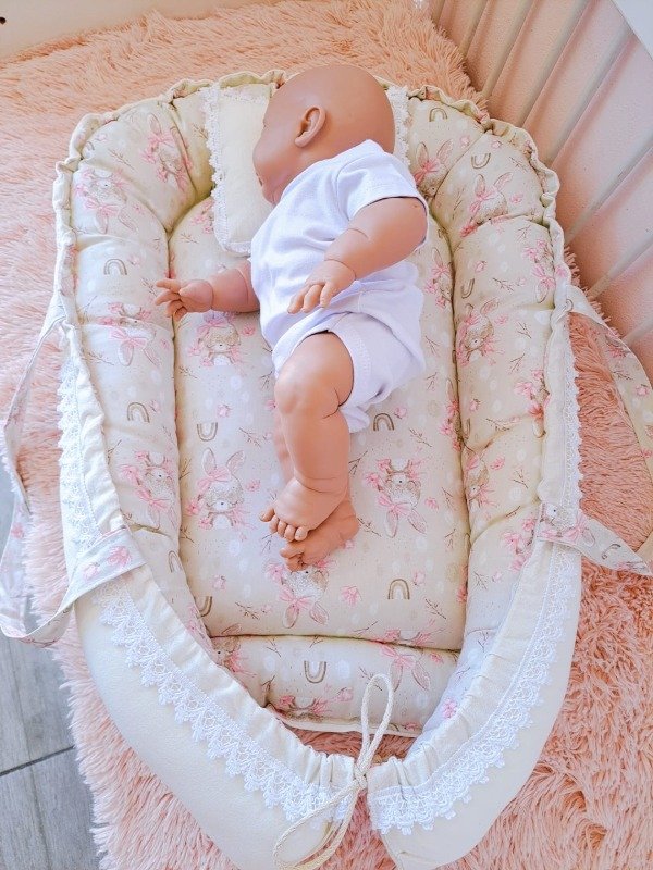 Nido de conteción confeccionado en telas de gabardina estampada y tussor liso de 100% algodón.
