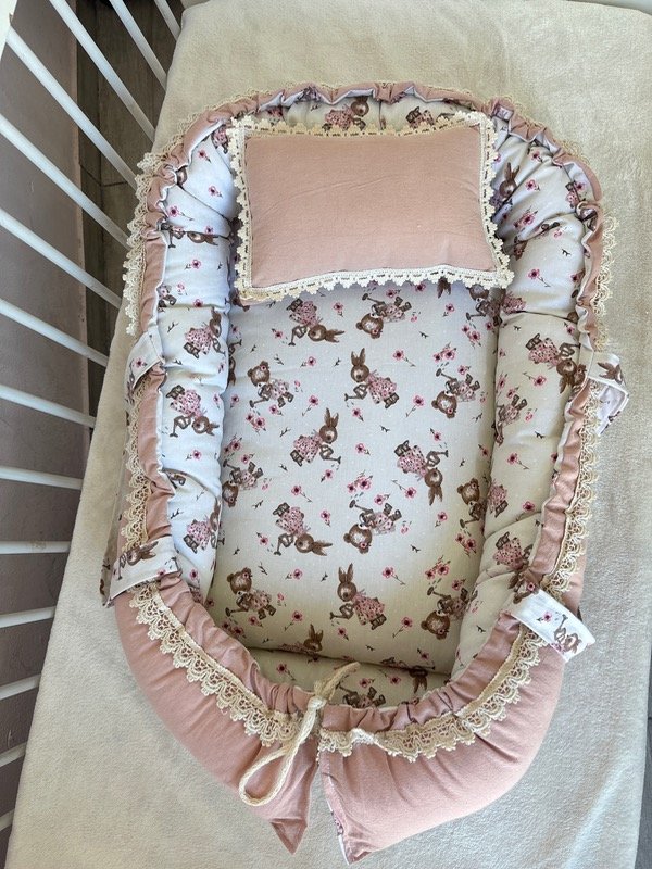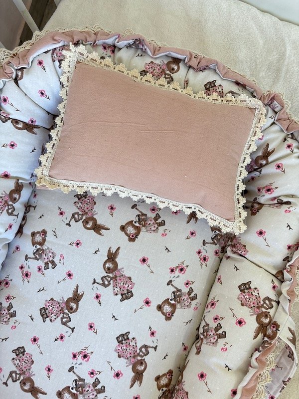 Nido de contención confeccionado en tela tusor y gabardina de algodón hipoalergénico,con manijas y delicada puntilla,más almohadita decorativa de regalo