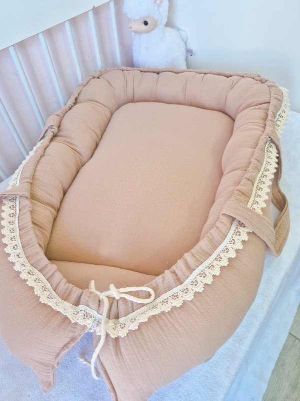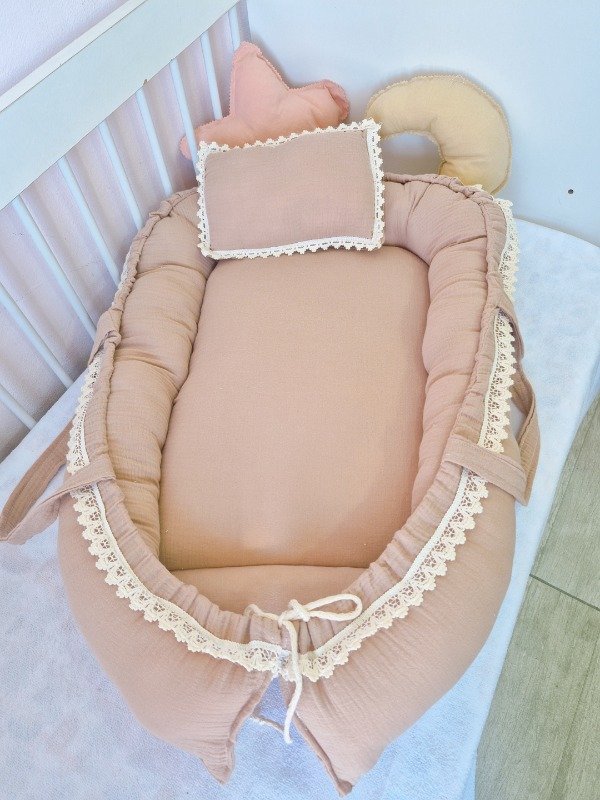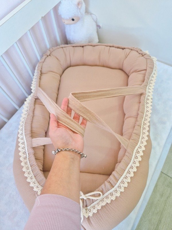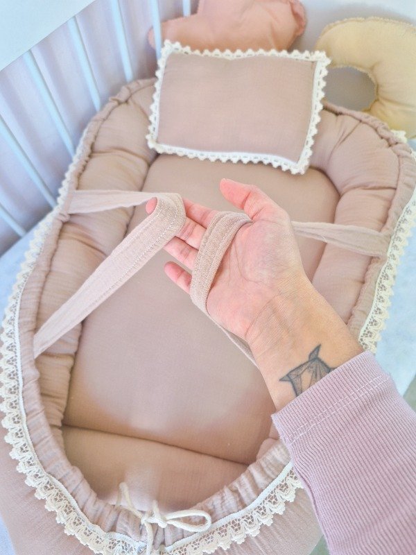 Nido con base de 70x90 (ABIERTO) con detalles de puntilla y manijas para trasladarlo fácil. Almohadita adorno🫶🏻