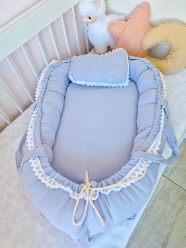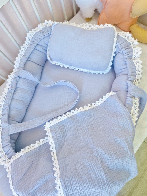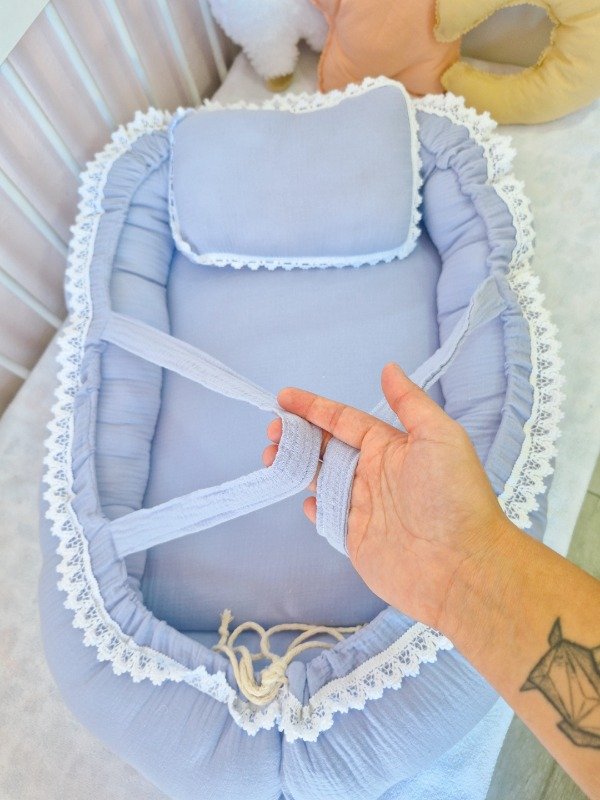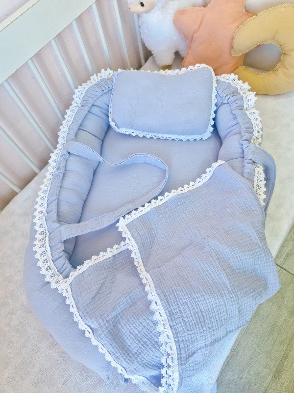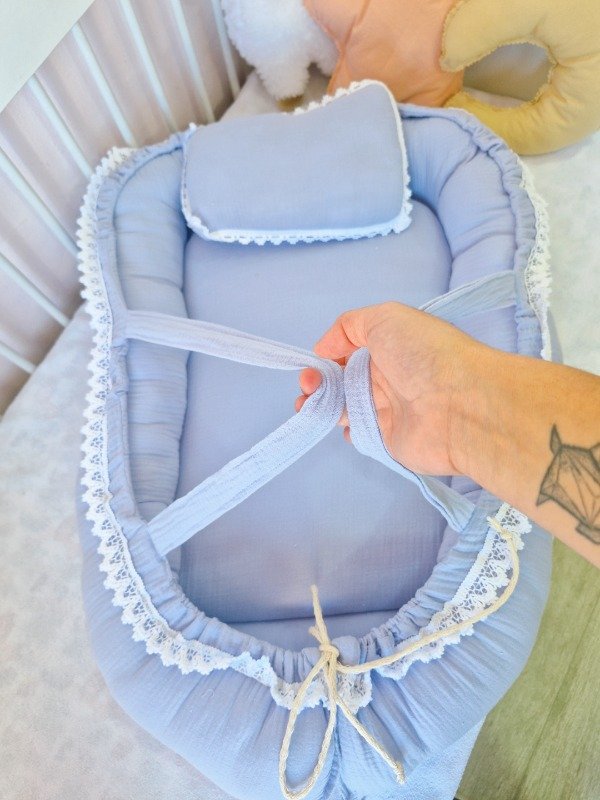 Nido con base de 70x90 (ABIERTO) con detalles de puntilla y manijas para trasladarlo fácil. Almohadita adorno🫶🏻