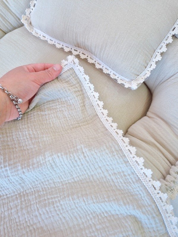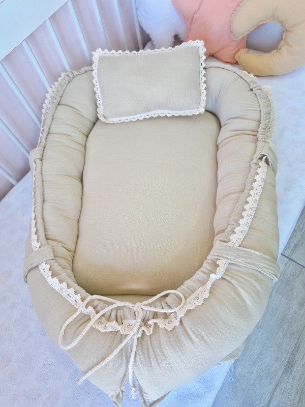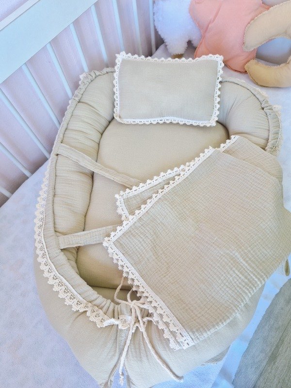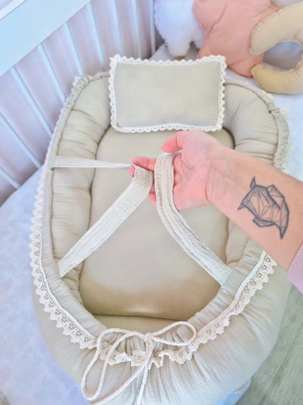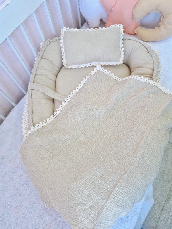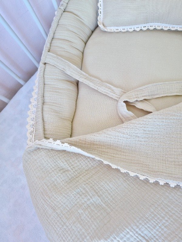 Nido con base de 70x90 (ABIERTO) con detalles de puntilla y manijas para trasladarlo fácil. Almohadita adorno🫶🏻