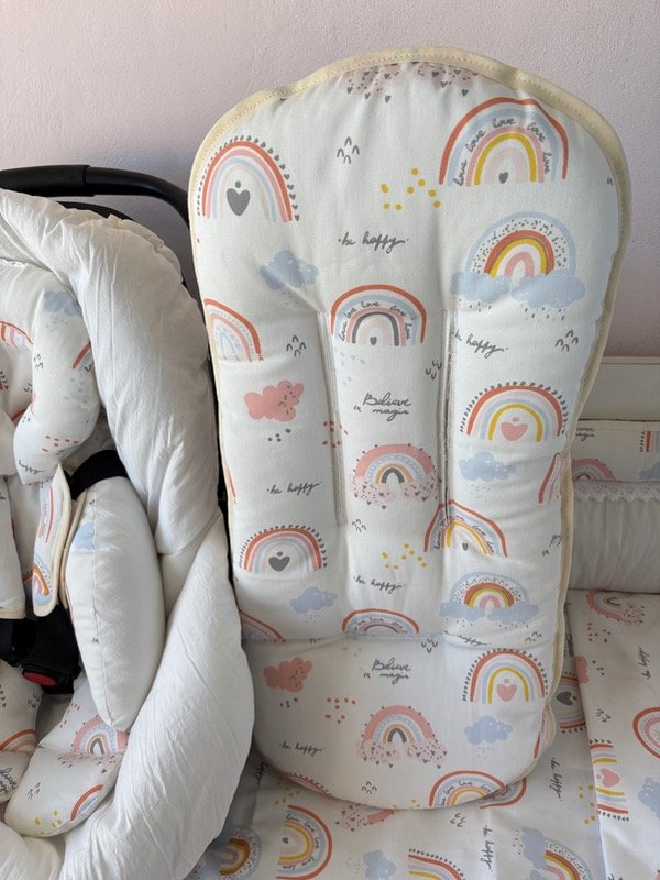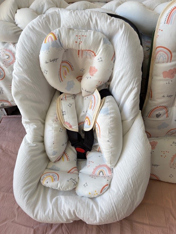 Funda de huevito, reductor de huevito, cochesitos y butacas de auto con cabecita desmontable y colchón de coche todo a juego.