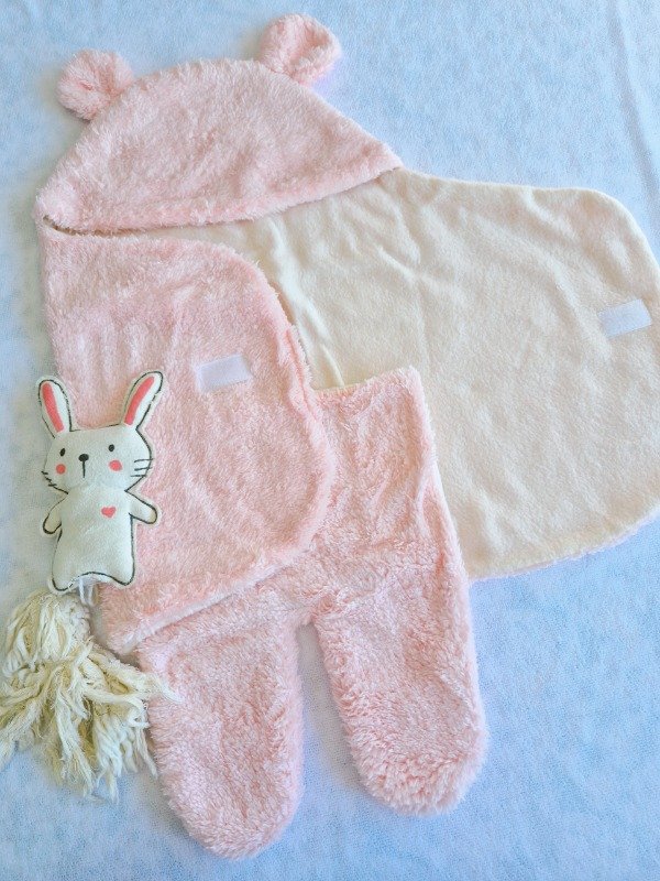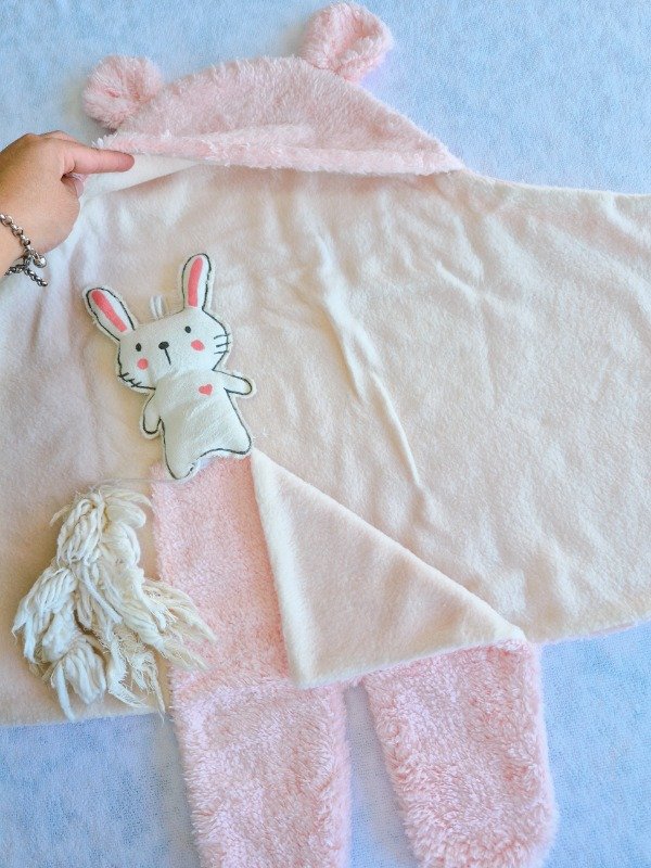 Con telas de abrigo de corderito por fuera y polar de adentro, con capucha con orejas.