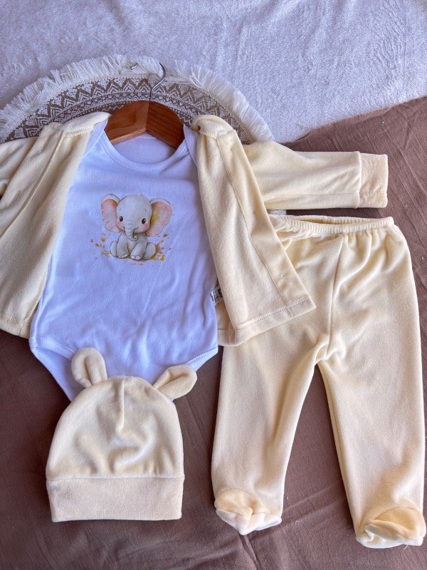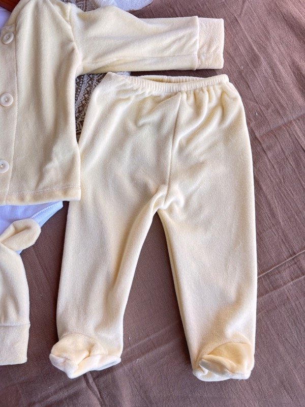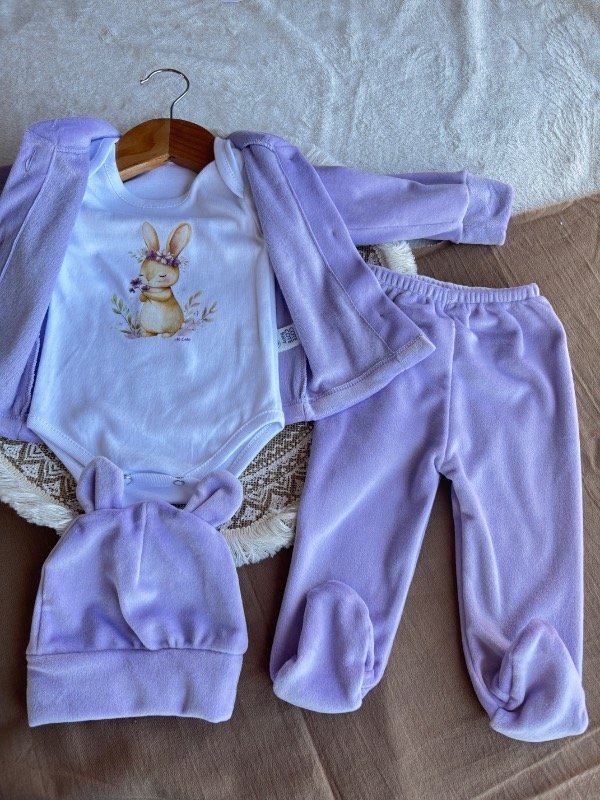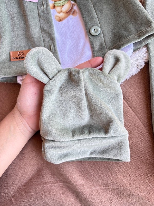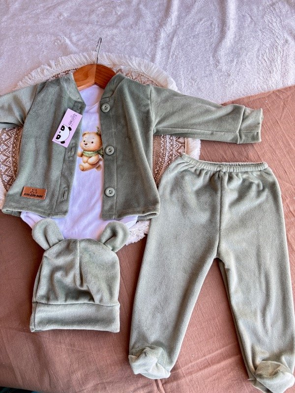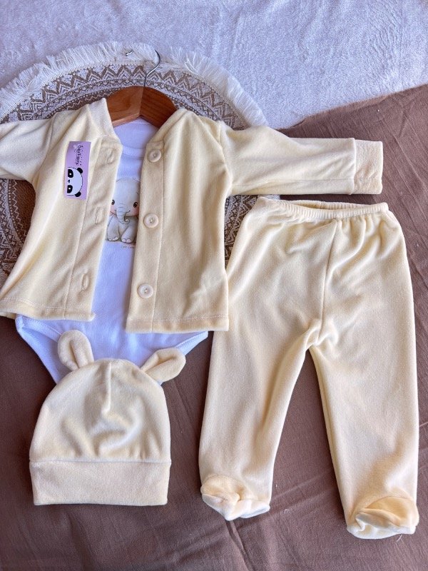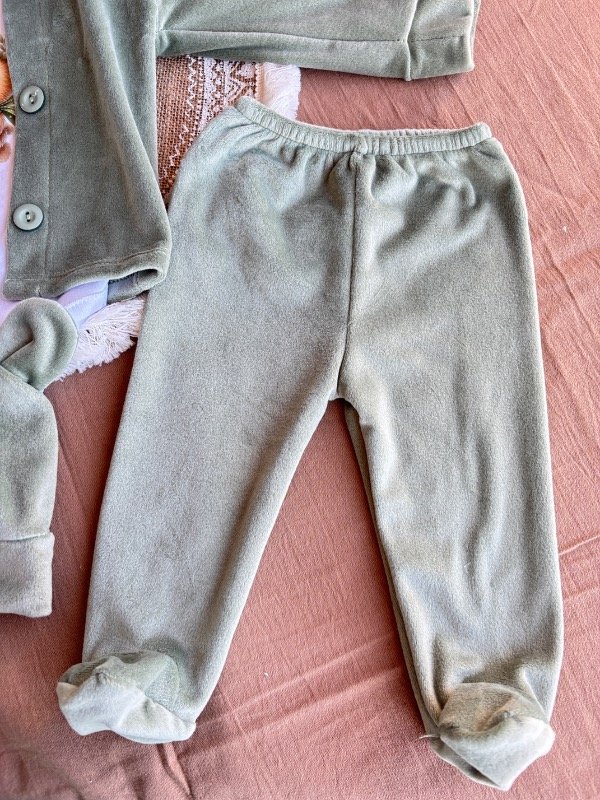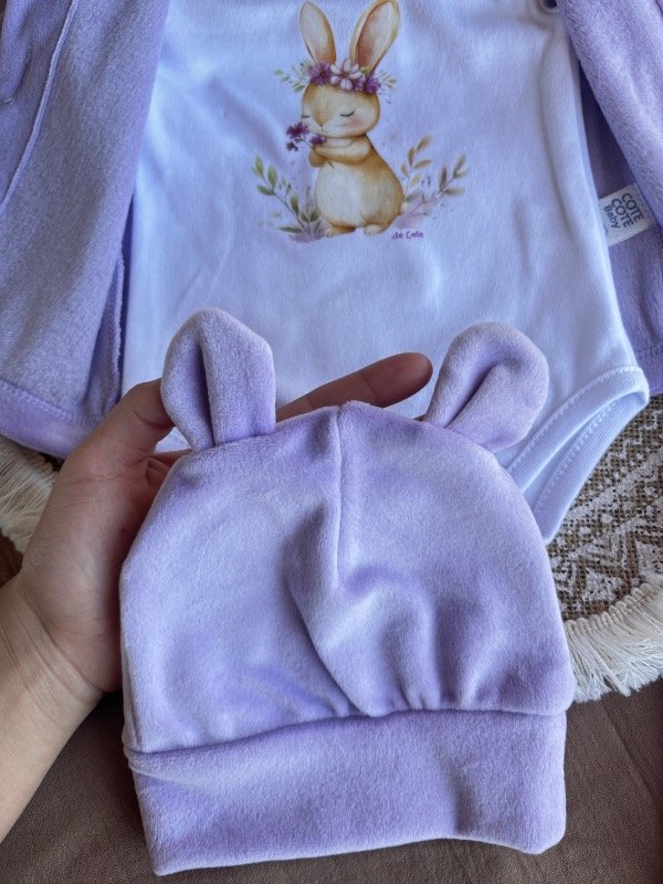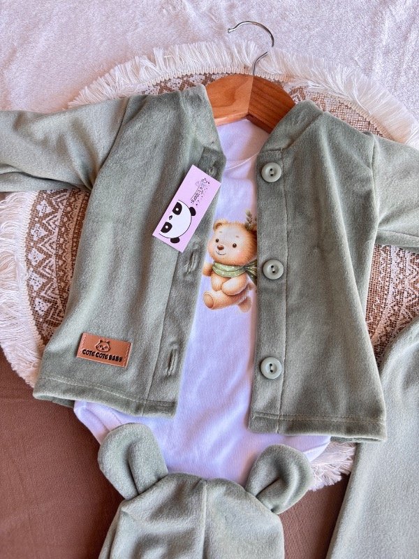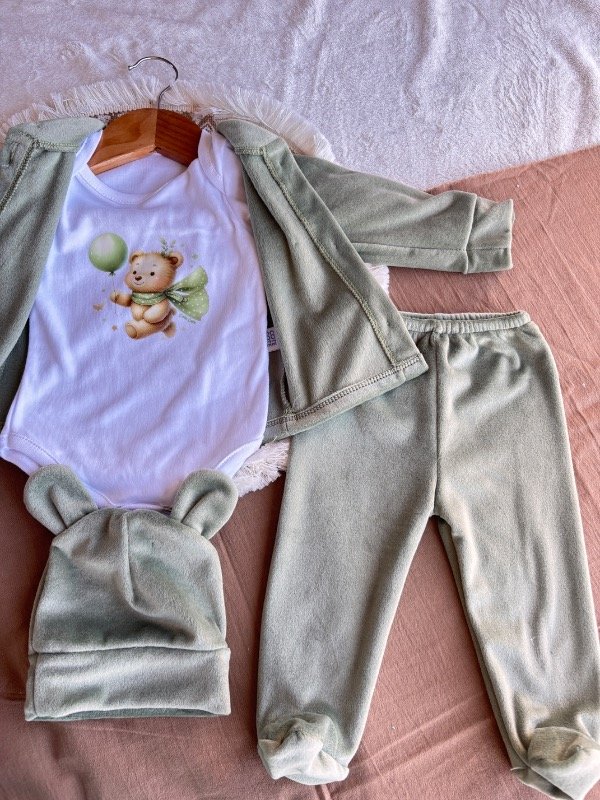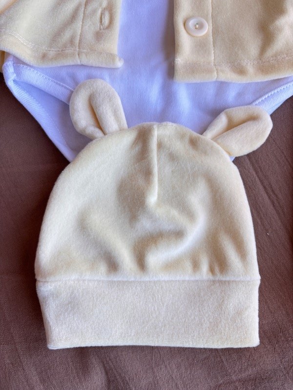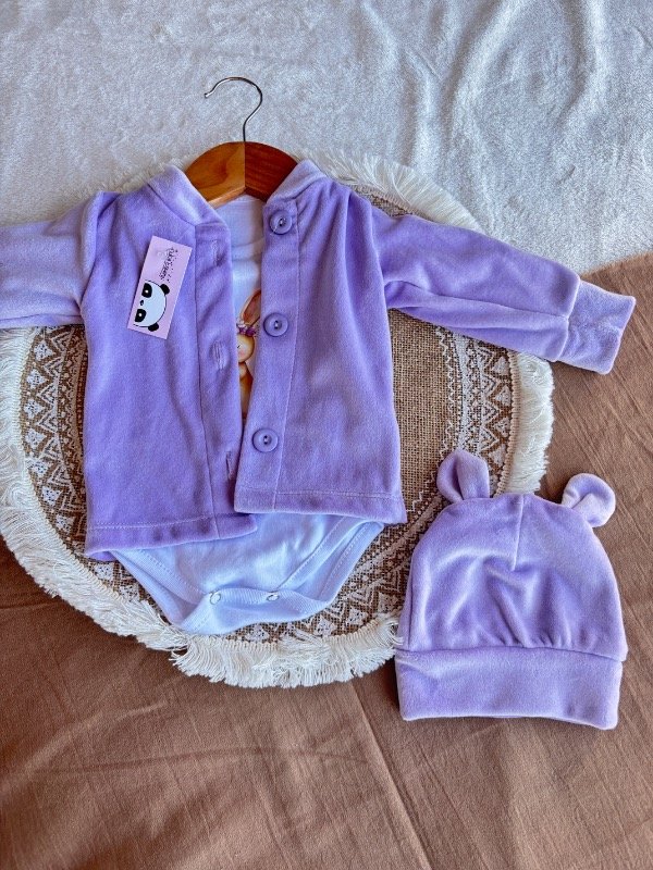 Conjunto de campera y ranita de plush con gorrito y body de algodon con cuello americano