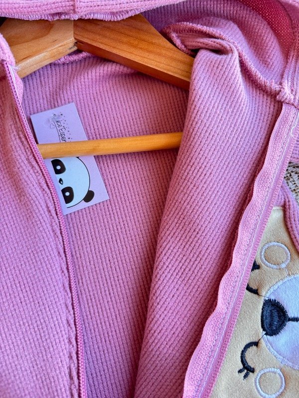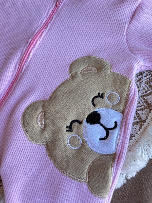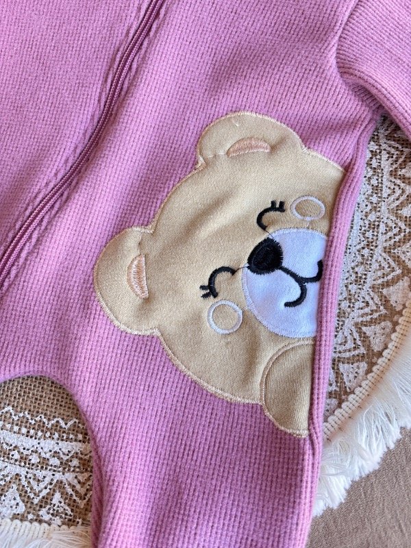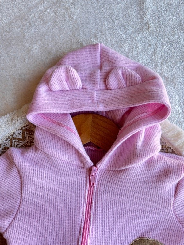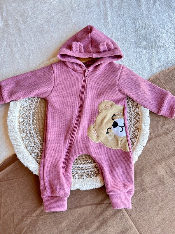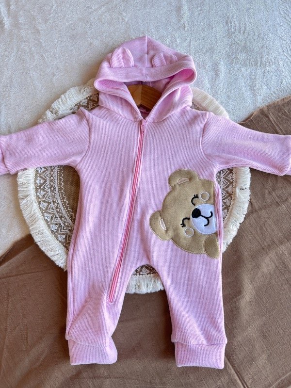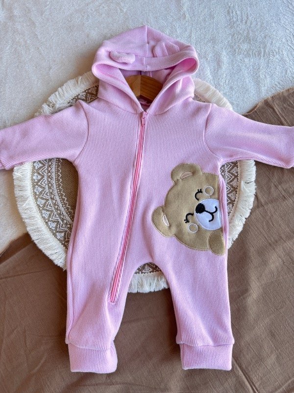 Con piesitos, cierre hasta abajo, detalles de picot y gorrito con orejas.