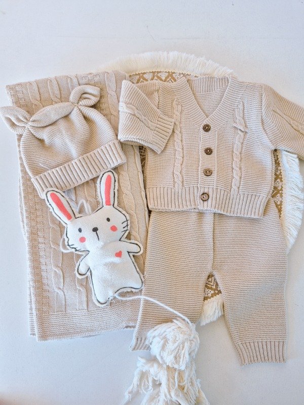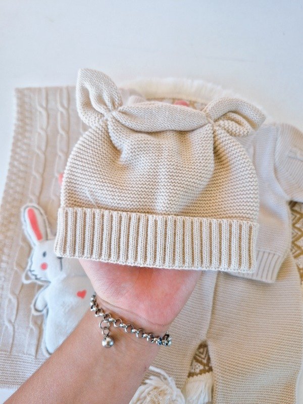 Mantilla recibidora con detalles trenzados, saquito con botones de coco, pantalon y gorrito con orejas