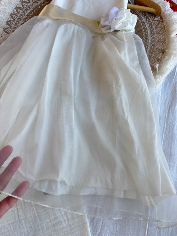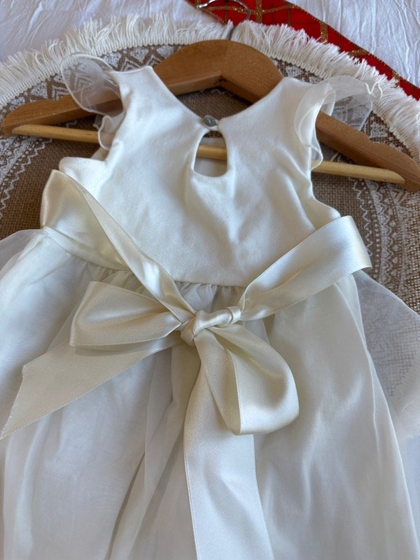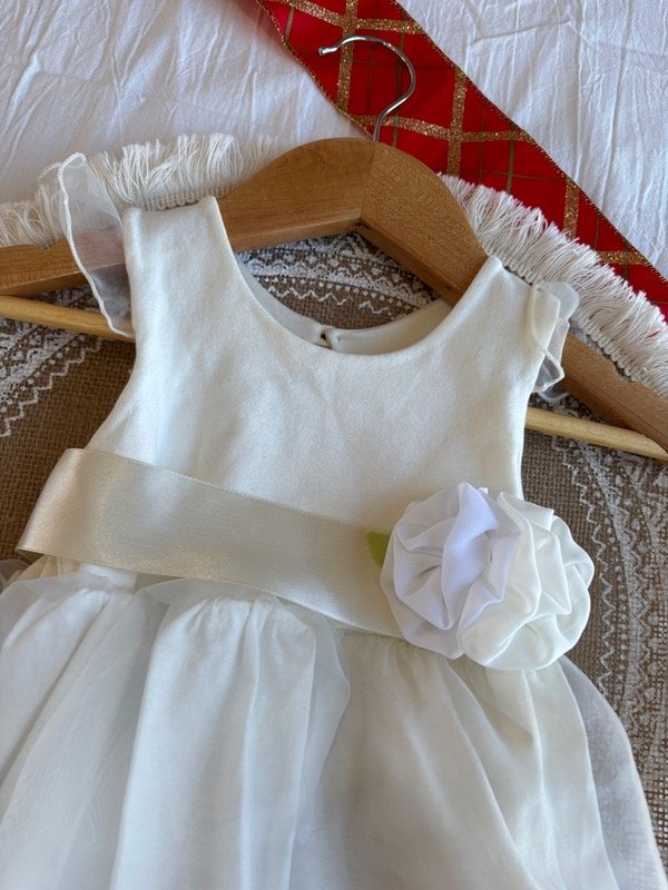 Vestido infantil blanco, delicado y elegante, con falda de tul, cintura satinada con lazo y detalle floral. Ideal para ocasiones especiales. ✨🤍