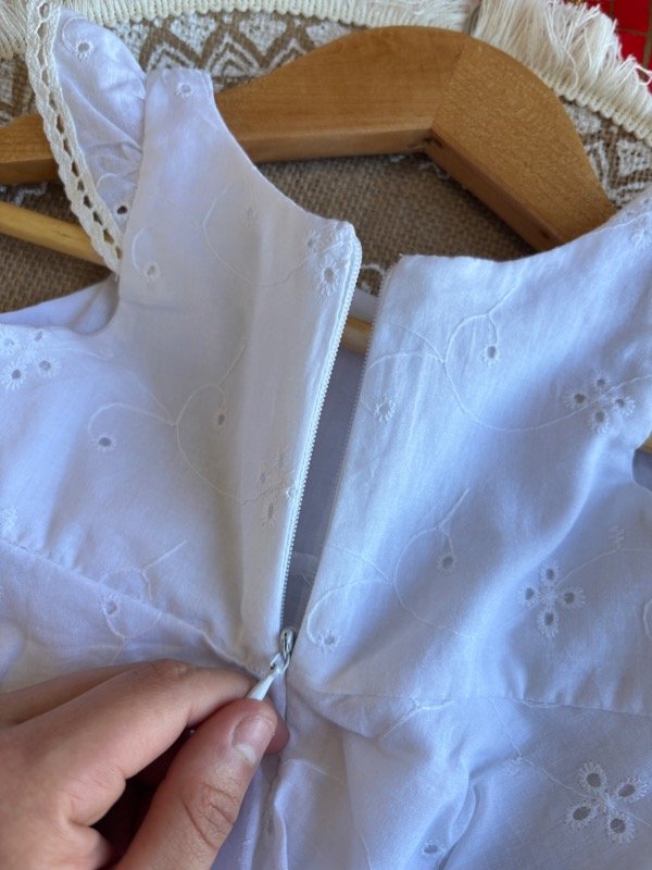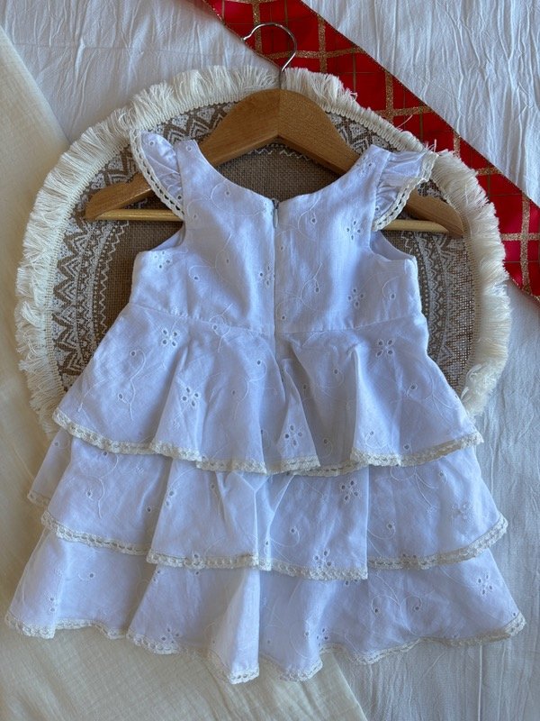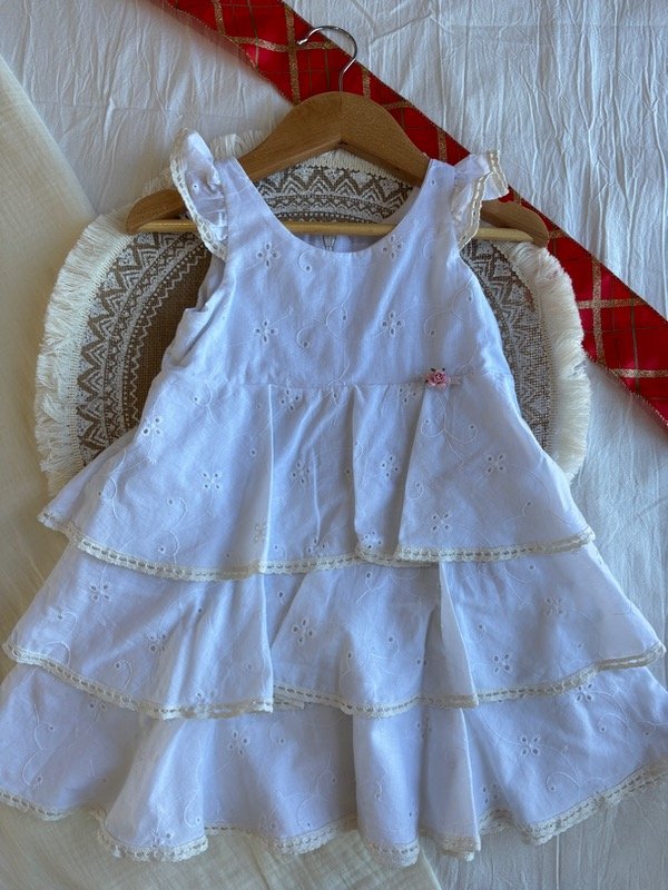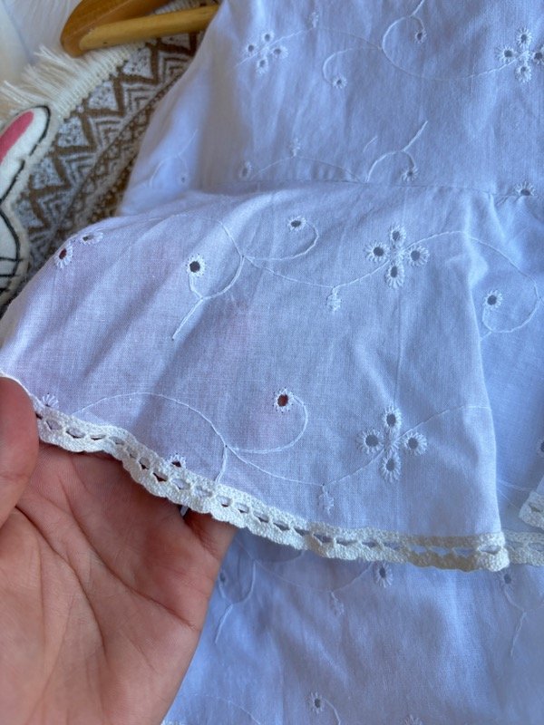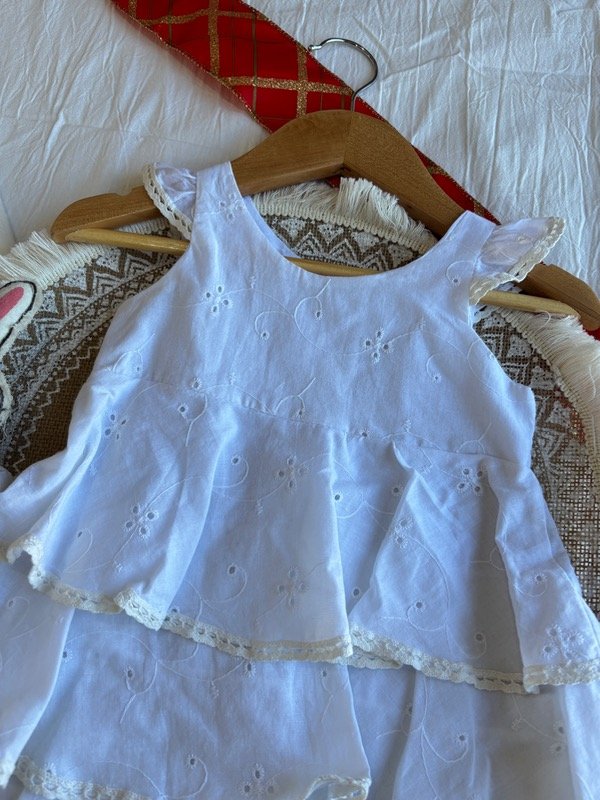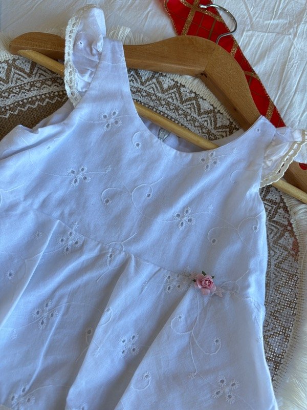 Vestido infantil blanco de broderie, con falda en volados escalonados, delicados detalles de puntilla y aplique floral. Fresco, romántico y súper delicado ✨