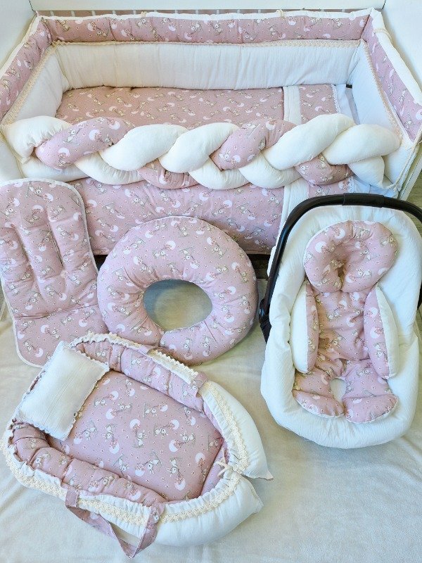 Por un lado el set de cuna: con acolchado, chichonera, sábanas, trenza que cubre un costado de la cuna y un almohadon personalizado🫶🏻 todo REVERSIBLE