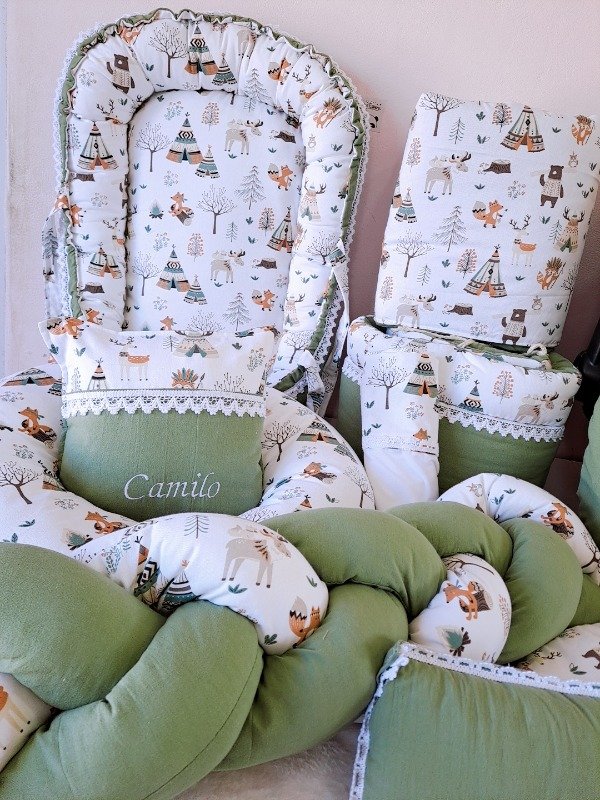 Por un lado el set de cuna: con acolchado, chichonera, sábanas, trenza que cubre un costado de la cuna y un almohadon personalizado🫶🏻 todo REVERSIBLE
