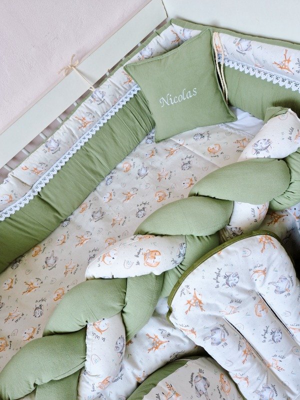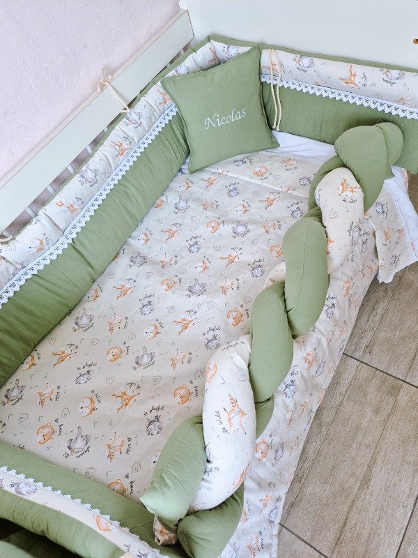 Por un lado el set de cuna: con acolchado, chichonera, sábanas, trenza que cubre un costado de la cuna y un almohadon personalizado🫶🏻 todo REVERSIBLE